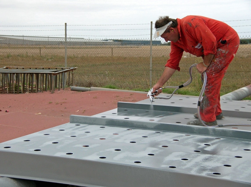 Il est toujours recommandé de traiter les coins, angles aigus, boulons et écrous avec une couche de délimitation (à la brosse) avant application de la couche uniforme par spray.